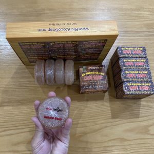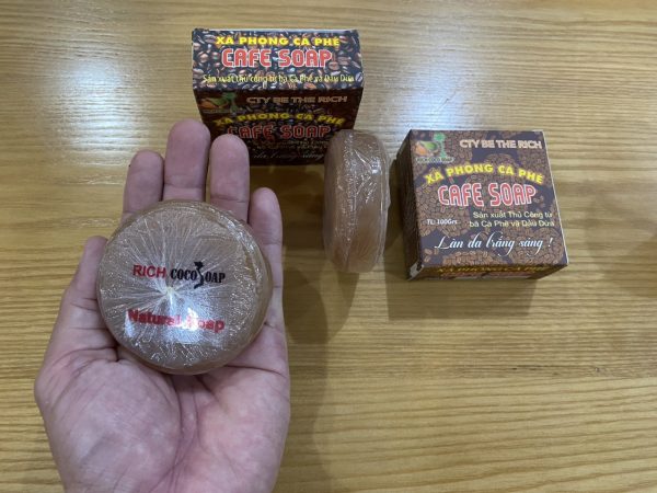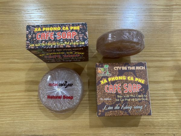 1./ XÀ BÔNG CÀ PHÊ – CAFE SOAP làm hand-made từ bã cà phê ( coffee) nên chứa nhiều chất chống oxy hóa nên giúp da tẩy tế bào chết và các tạp chất bụi bẩn trong lổ chân lông, làm da sáng trắng nhẹ nhàng tự nhiên. Lycerin được tạo ra trong quá trình làm xà phòng dừa theo cách truyền thống có khả năng làm tăng giữ ẩm cho da làm mềm da.